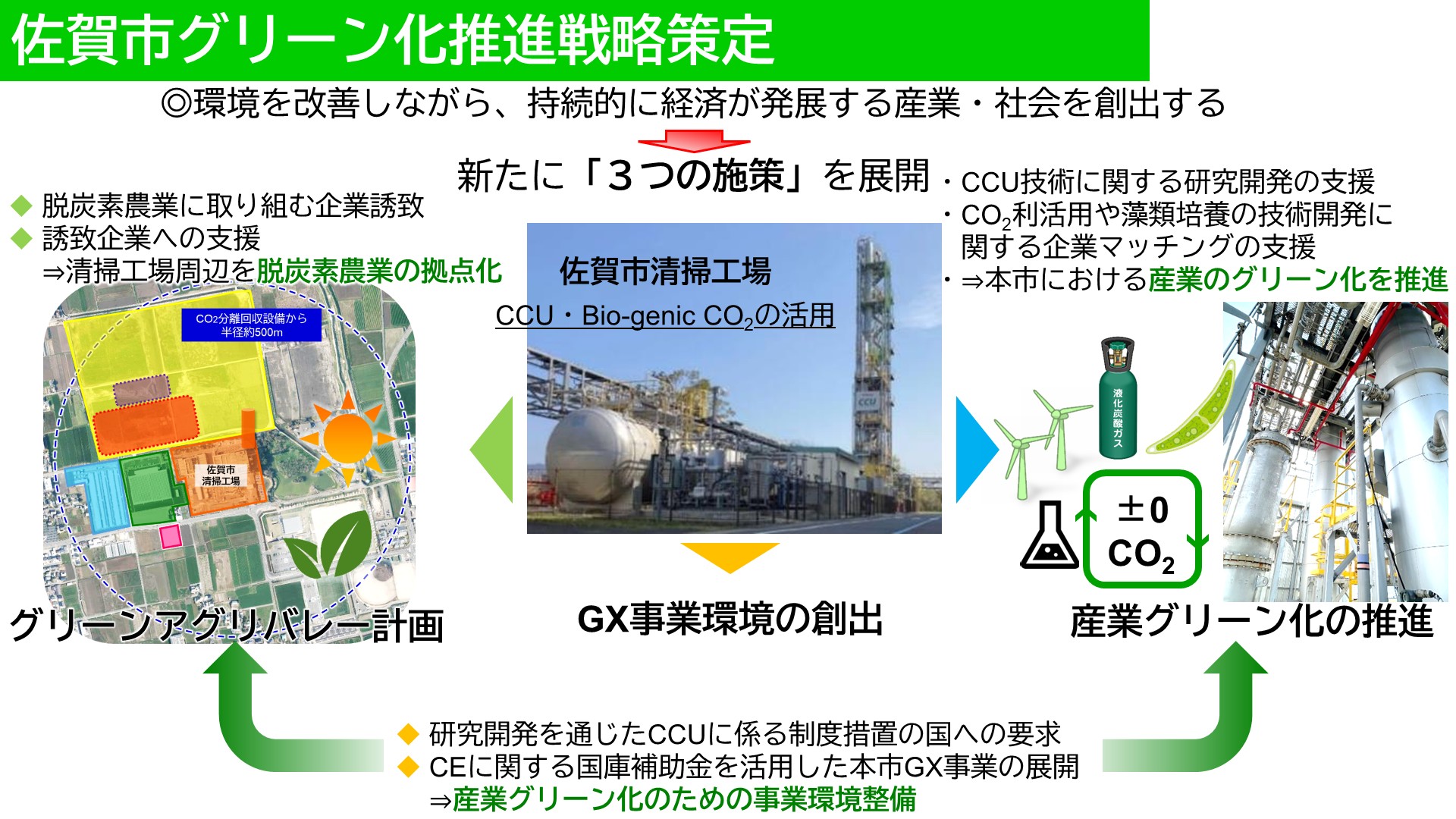 佐賀市は、「脱炭素」と「経済成長」が両立する社会を創出するGX(グリーン・トランスフォーメーション)の実現に向けて、「佐賀市グリーン化推進戦略」を策定しました。清掃工場の排ガスから分離回収した二酸化炭素を藻類培養や農業に活用し、産業の育成をはかる二酸化炭素分離回収利活用事業(CCU事業)を核に、佐賀市に民間事業者のGX投資を呼び込むことを目指します。