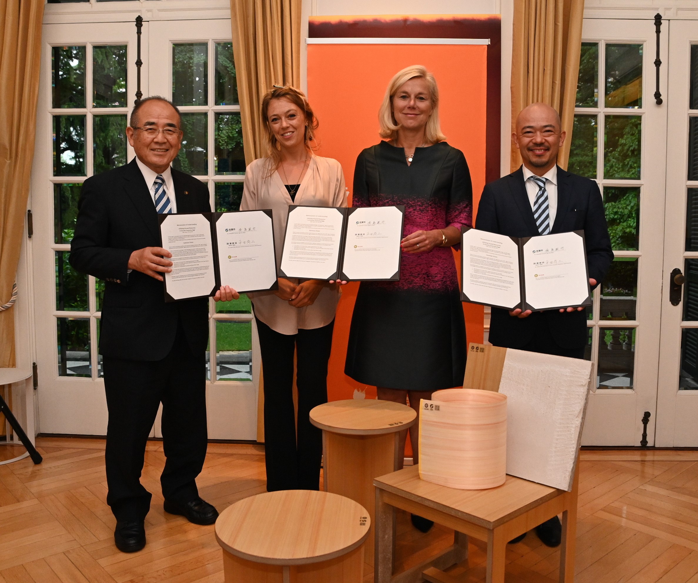 覚書の締結は、東京都港区のオランダ大使館で行われました。佐賀市から秀島敏行市長、諸富家具振興協同組合からは平田尚二理事長が6月10日に赴き、署名しました。