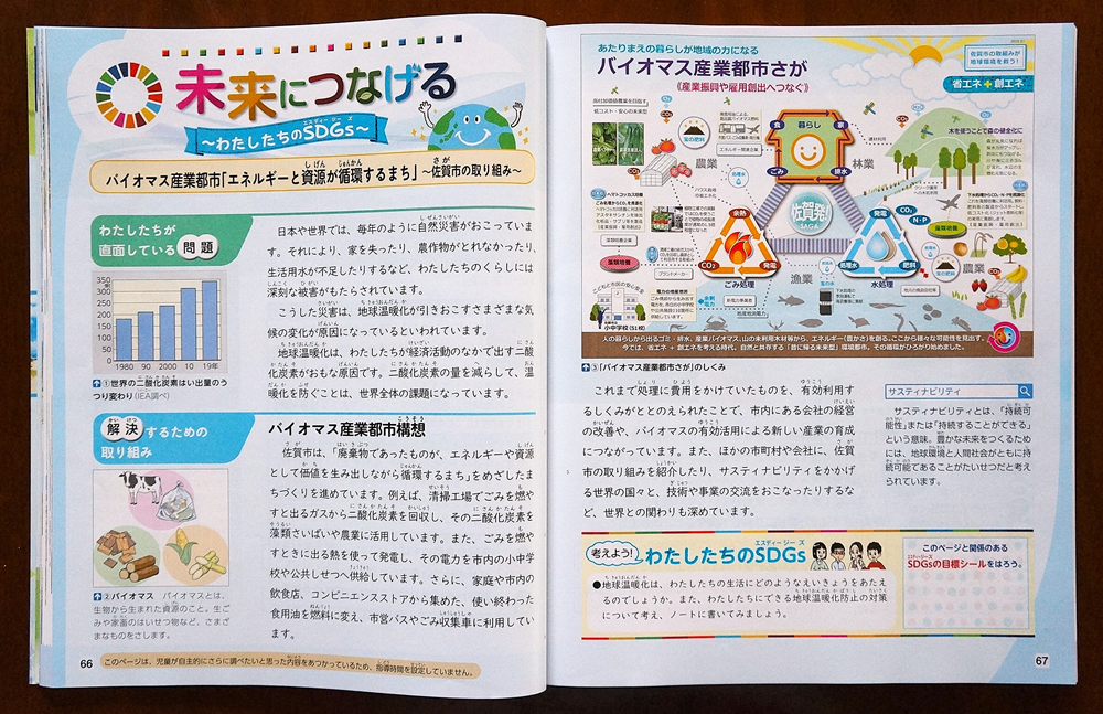 佐賀市のバイオマス事業が、日本文教出版株式会社が発行している本年度小学5年用の社会科教科書で紹介されています。現代のさまざまな課題に対応する地域の取り組みなどを取り上げた特設ページ「未来につなげる~わたしたちのSDGs~」に掲載され、子どもたちがよりよい未来を考えるための素材となっています。