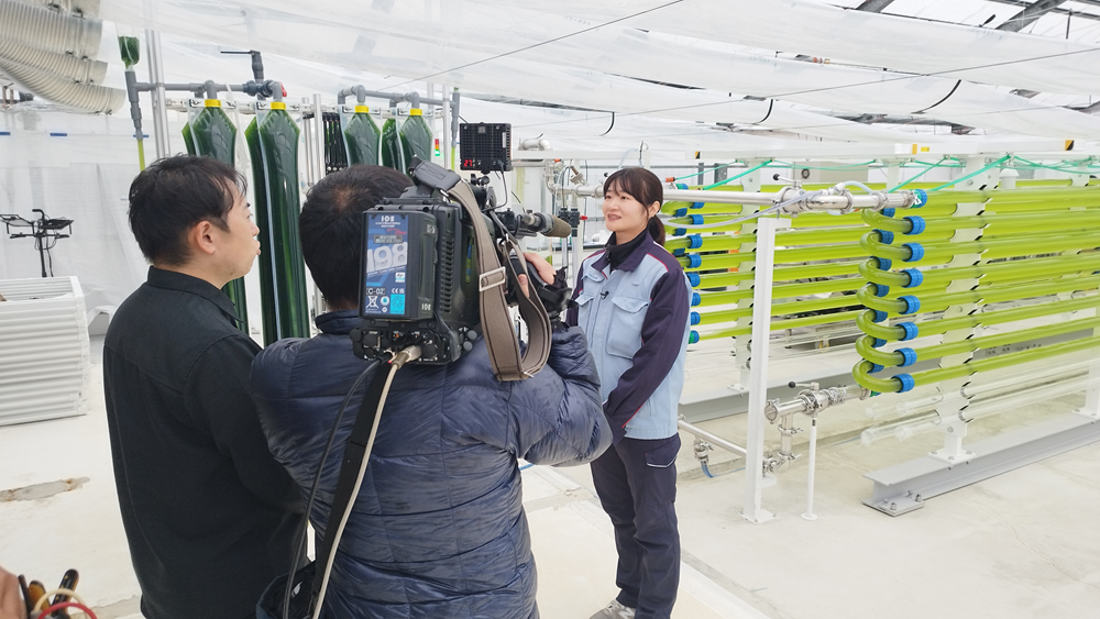 魚の陸上養殖と野菜の水耕栽培を組み合わせた「アクアポニックス」を特集する中で熊谷組の事業を紹介、独自株を用いた「微細藻類培養」とアクアポニックスを掛け合わせていることを同社の事業の特色として上げました。同社は微細藻類を魚や植物に与えることで成長促進などの効果を見込んでいるとし、「廃校などの使われなくなった施設をリノベーションして、その中にこのシステムを入れ込み、パッケージとして提供できれば」と話しました。。