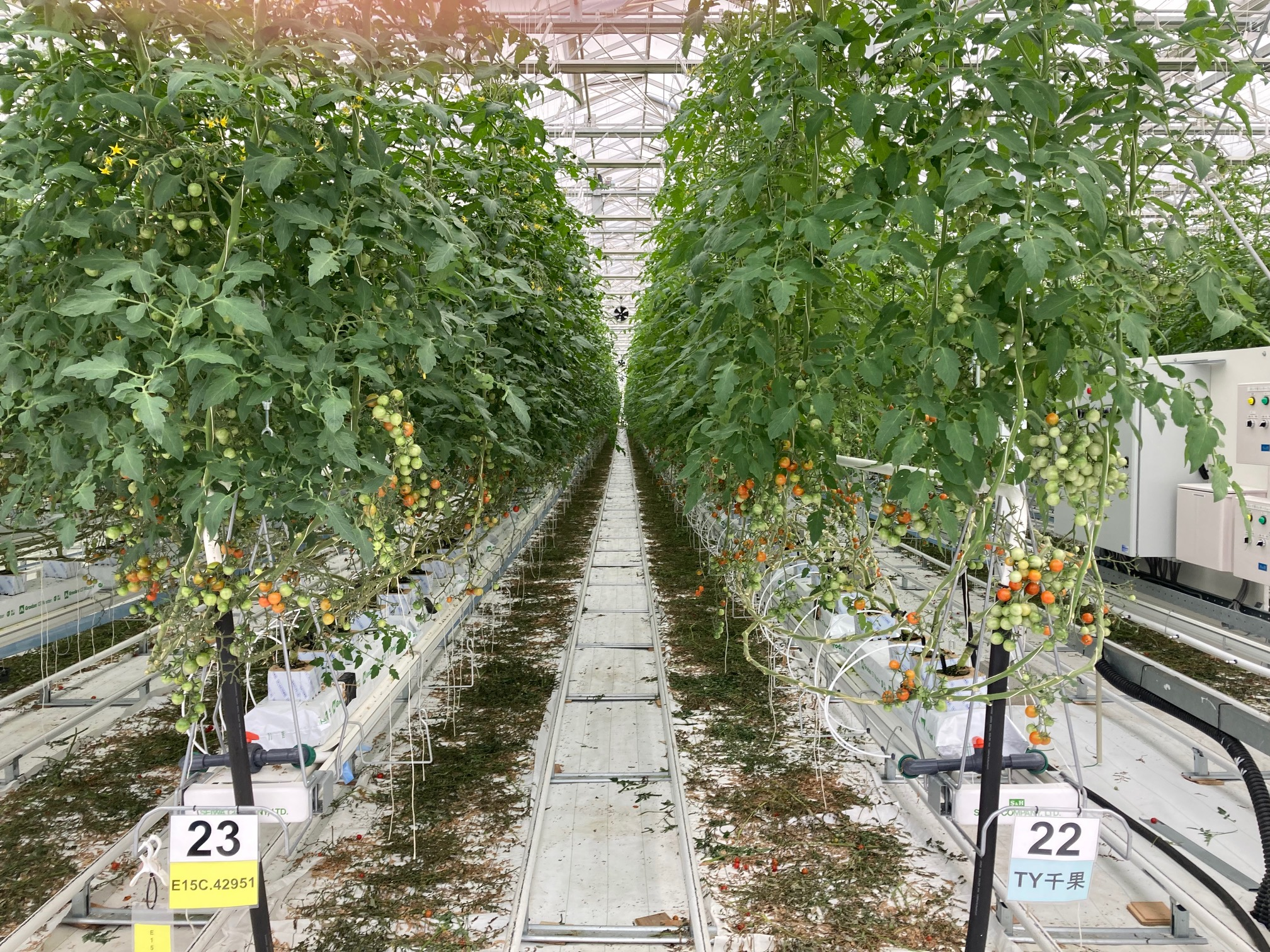 同農園は約2・2ヘクタールの敷地に約1・4ヘクタールのハウス(栽培面積約1・2ヘクタール)を設置。コンピューターと各種センサーを用いて光や温度、CO2などを総合的に調整し、光合成を最大化させる栽培管理によって、佐賀県平均の約5倍にあたる10アールあたり30トンの収量を上げる目標を掲げています。