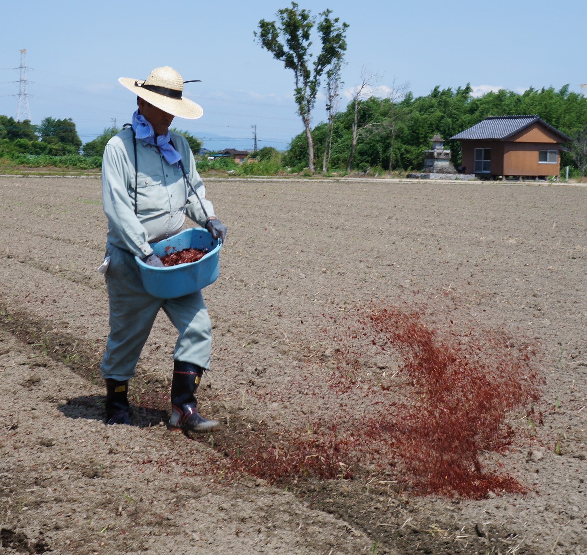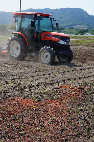 昨年、試験的に栽培したアスタキサンチン米の出来が良く、今年から本格的に取り組むことにしました。栽培するのは神埼町の栁川芳和さんが所有する約4300㎡の水田で、6月10日、栁川さんが約20㎏のアスタキサンチンのドライフレークをまき、トラクターで田起こしをして土壌にアスタキサンチンをすき込みました。6月下旬に、ヒノヒカリの苗を植えます。