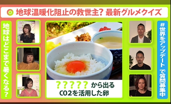 「Update the World」は、「news zero」に出演している辻愛沙子さん(クリエイティブディレクター)や岩本乃蒼さん(日本テレビアナウンサー)が進行役を務める、Twitter配信の番組です。8月27日(金)の放送では、地球温暖化をテーマに、クイズ形式でさまざまな「脱炭素」の取り組みを紹介しました。その中で「アスタキサンチン卵」については、佐賀市清掃工場の排ガスから分離回収した二酸化炭素を活用して育てられたヘマトコッカスを餌として鶏に与えて生まれたと紹介。Twitterには「ほえー、そんなのあるんだ」「無駄にしない取り組み」といった反応が上がっていました。