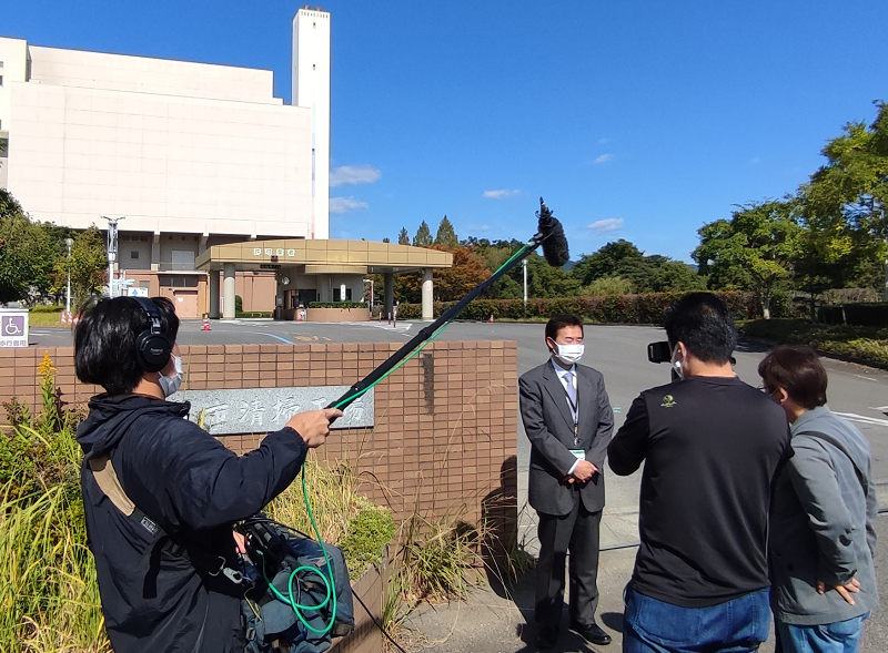 アルビータ社(左)と佐賀市清掃工場を取材するテレビ東京系番組のスタッフ