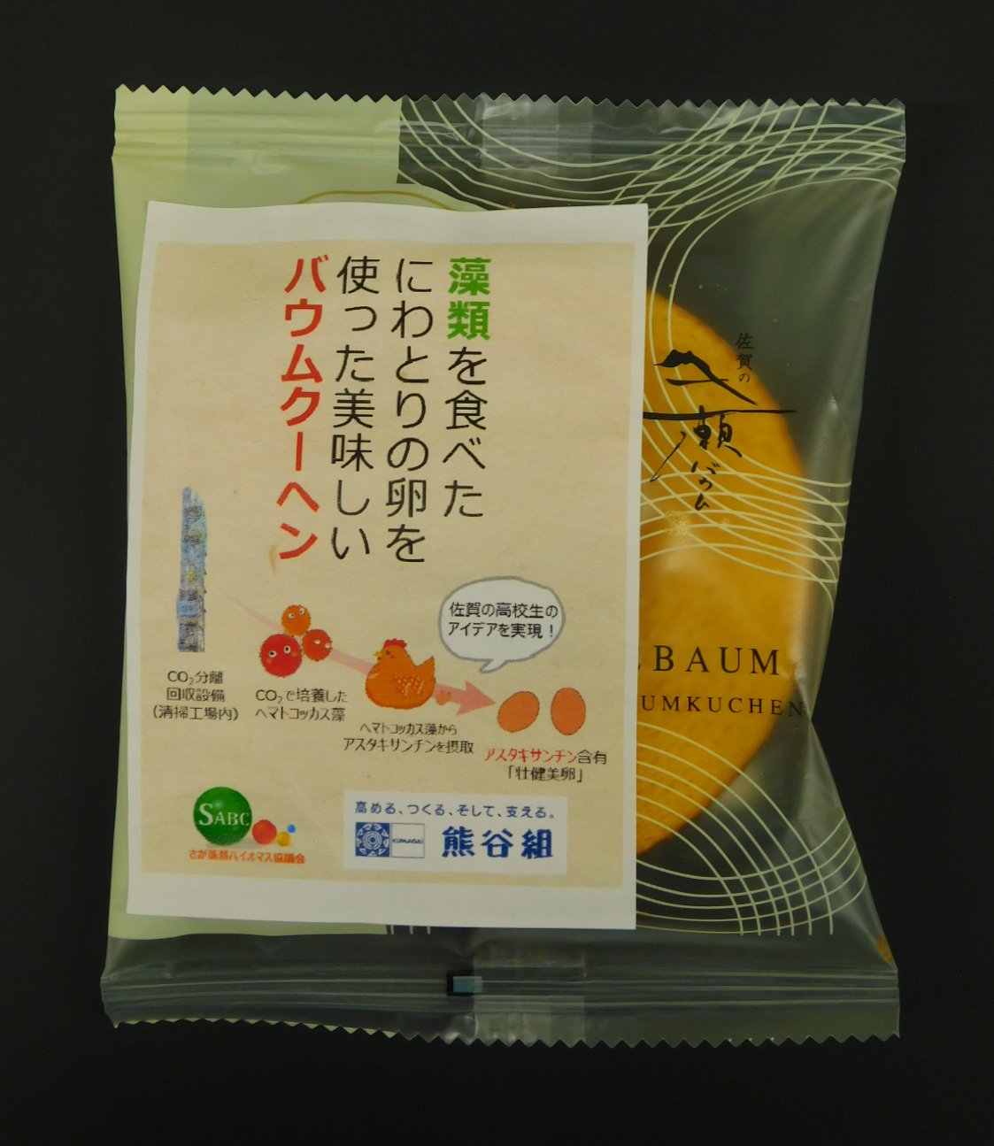 熊谷組では、この2品に二酸化炭素を活用して育てた微細藻類が産生したアスタキサンチンを含むことを示すラベルを張り、脱炭素に取り組む自社の姿勢や当協議会の活動をPRします。