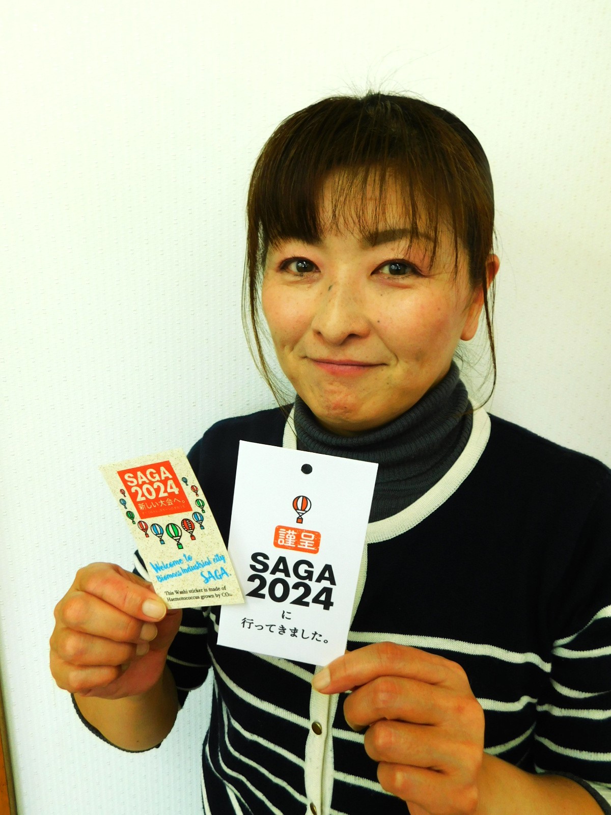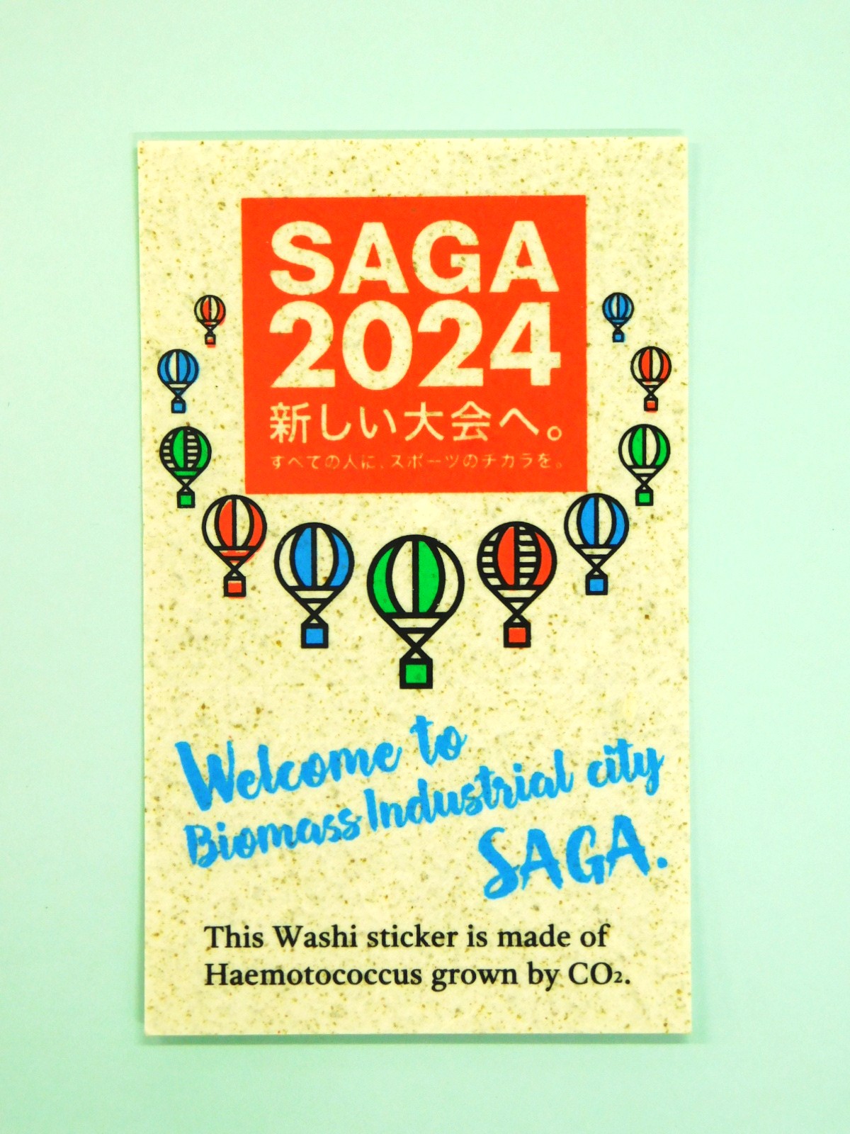 出来上がったステッカーは縦9cm、横5.5cm。「SAGA2024」の大会ロゴの周りにバルーンが浮かび、「Welcome to Biomass Industry City SAGA. This Washi is made of Haemotococcus grown by CO2」の文字が入っています。また商品を包装するポチ袋には「この和紙ステッカーの赤い点はアスタキサンチンを含む微細藻類『ヘマトコッカス』です。次世代の循環型資源として期待される微細藻類です。佐賀市は廃棄物が資源として循環する『バイオマス産業都市』を目指しています」と記載しました。