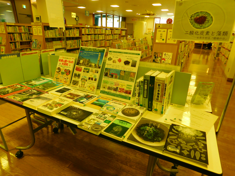 佐賀市立図書館で、微細藻類や二酸化炭素の利活用に関する本や資料を集めた展示が行われています。6月の「環境月間」に合わせた企画で、6月末まで開かれています。