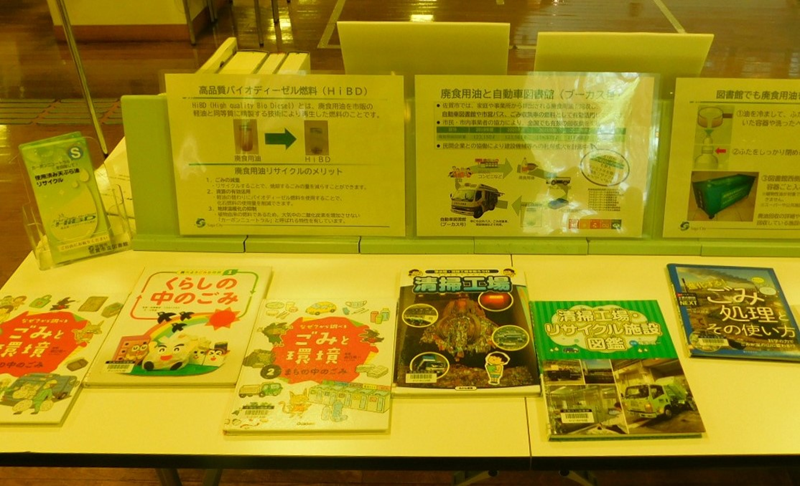このうち「二酸化炭素と藻類」のコーナーには、微細藻類や海藻の本や図鑑、二酸化炭素と地球環境をテーマとした本が並ぶほか、佐賀市の二酸化炭素利活用事業や「微細藻類とは何か」を紹介するパネルを展示。身近な暮らしとごみに焦点を当てた「食用油のリサイクル」コーナーには、子ども向けの『くらしの中のごみ』『ごみと環境』などの本を置き、廃食用油をリサイクルした高品質バイオディーゼル燃料が自動車図書館や市営バスにも活用されていることを紹介しています。