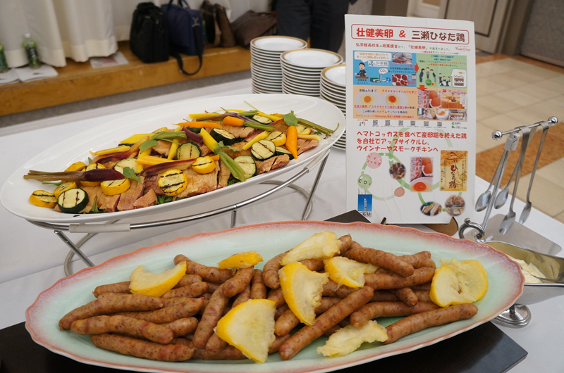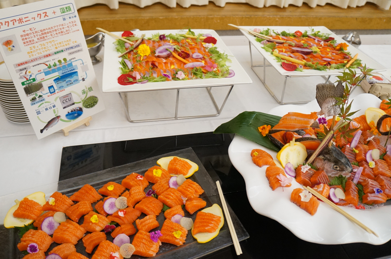 総会終了後には参加者による交流会も開催しました。熊谷組が取り組むアクアポニックスシステムを開発した熊本の企業が育てたサーモンや、㈲ムーラン・ルージュが㈱アルビータのヘマトコッカス藻を給餌して育てた鶏のウインナーやハムを使った料理も提供し、参加者はこれらの料理に舌鼓を打ちながら交流を深めました。