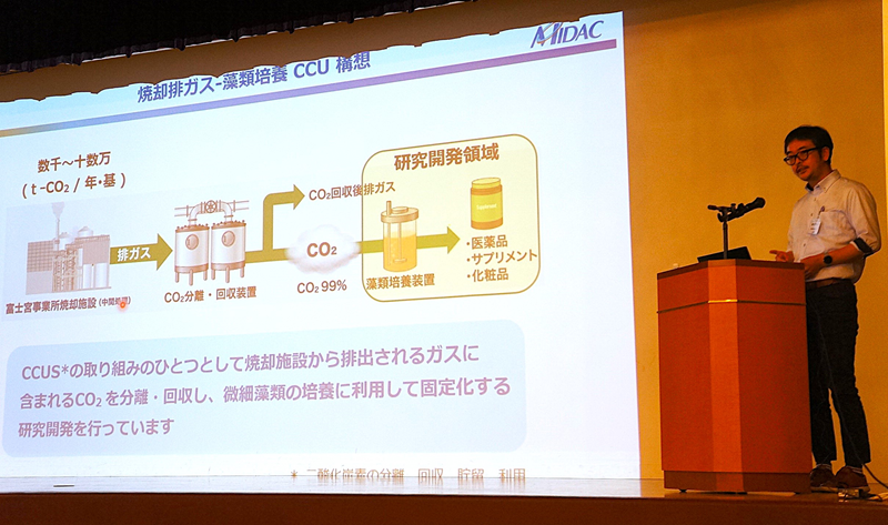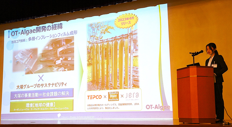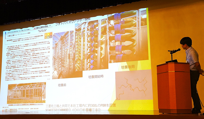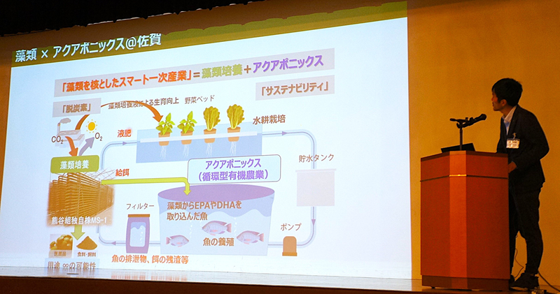 総会後半では、佐賀大学さが藻類産業共同研究講座の出村幹英准教授が同大学での研究の現状について発表、続いて会員企業が藻類事業についてのプレゼンテーションを行いました。焼却施設のCO2を利用した藻類培養を目指す㈱ミダック、培養や抽出など各種の機器を手掛ける三菱化工機アドバンス㈱、培養装置を開発した大塚テクノ(株)、藻類を活用したアクアポニックスの実証事業を佐賀市で行っている㈱熊谷組など5社が自社の藻類事業への姿勢や開発した製品の特長などをアピールし、新たなビジネス連携を呼びかけました。