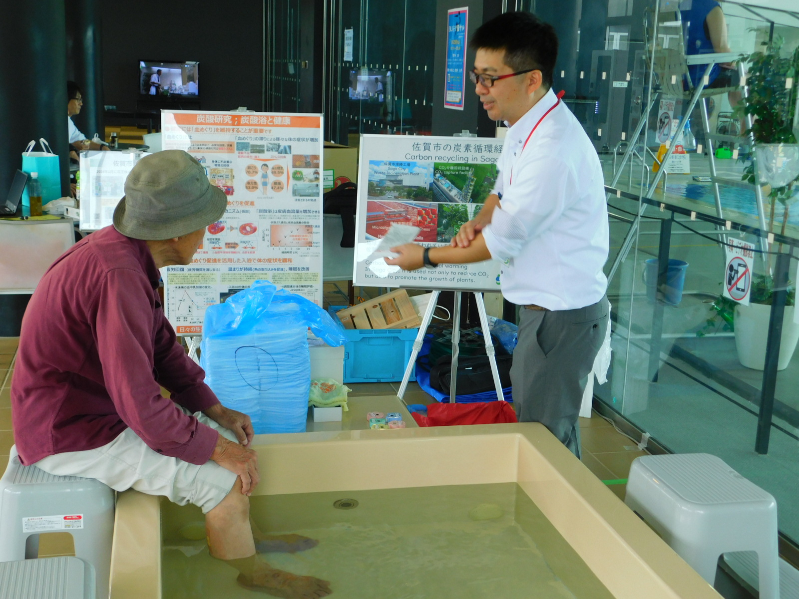 佐賀市清掃工場の排ガスから分離回収した二酸化炭素の利活用を進める事業の一環。センターを訪れる市民に足湯でくつろいでもらいながら、微細藻類の培養や施設園芸などの産業に清掃工場由来の二酸化炭素が使われている現状を紹介しました。