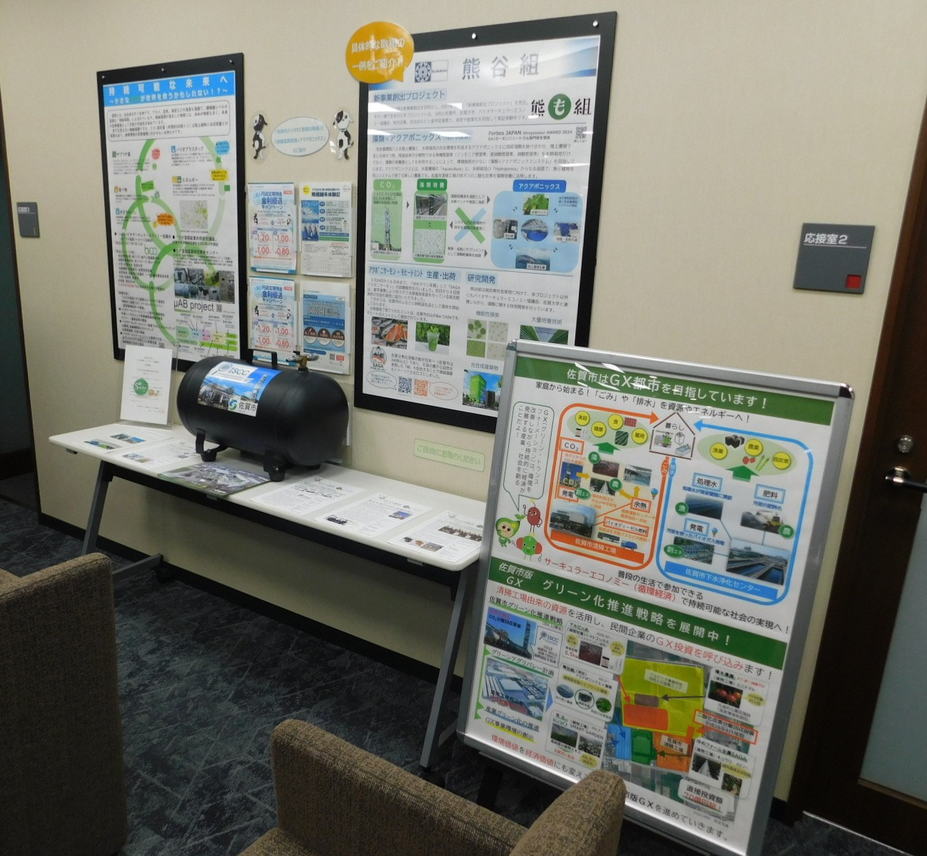 パネルでは、さまざまな有用成分を含み、健康食品やバイオプラスチックなどの材料になる微細藻類の可能性や、佐賀市清掃工場由来の二酸化炭素や熱などの資源を活用して民間投資の呼び込みを目指す「佐賀市GX化推進戦略」について解説。魚の陸上養殖と野菜の水耕栽培を掛け合わせたアクアポニックスと藻類培養を組み合わせた、㈱熊谷組の環境保全型ハイブリッド農業を紹介しています。